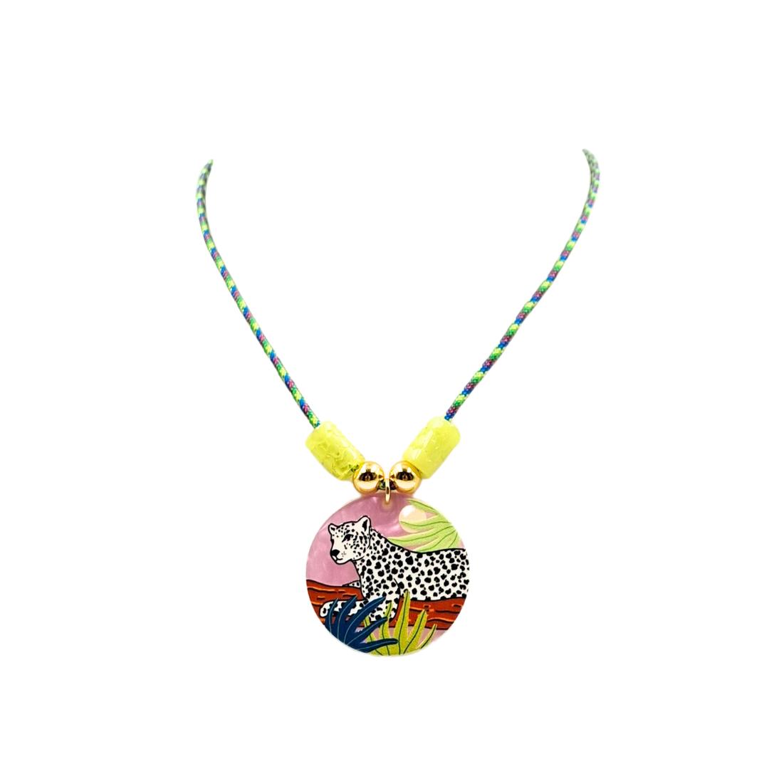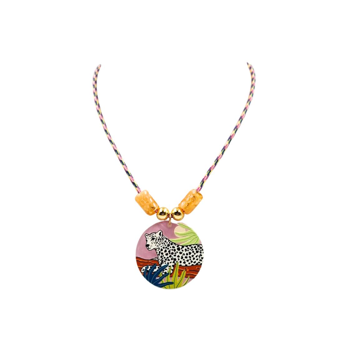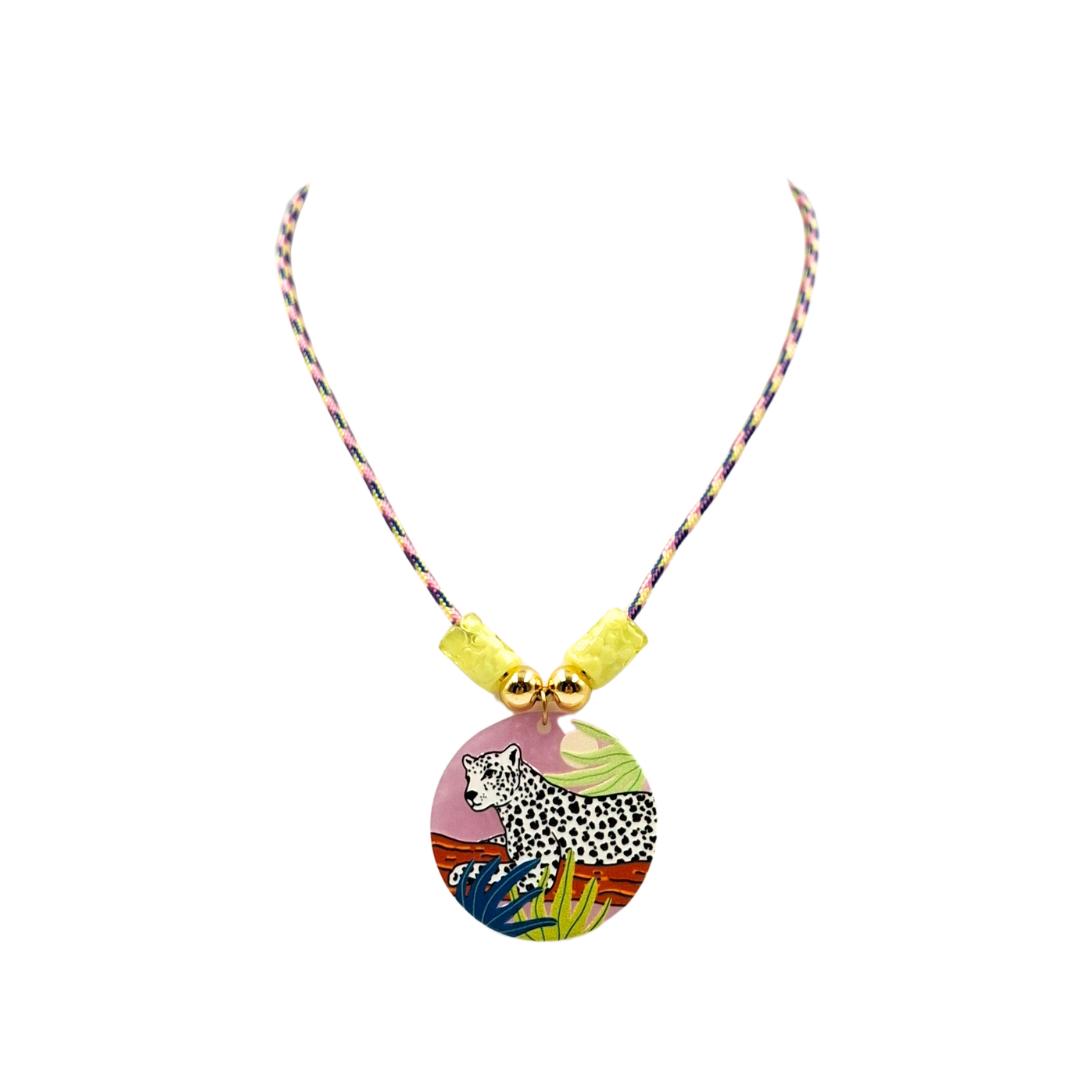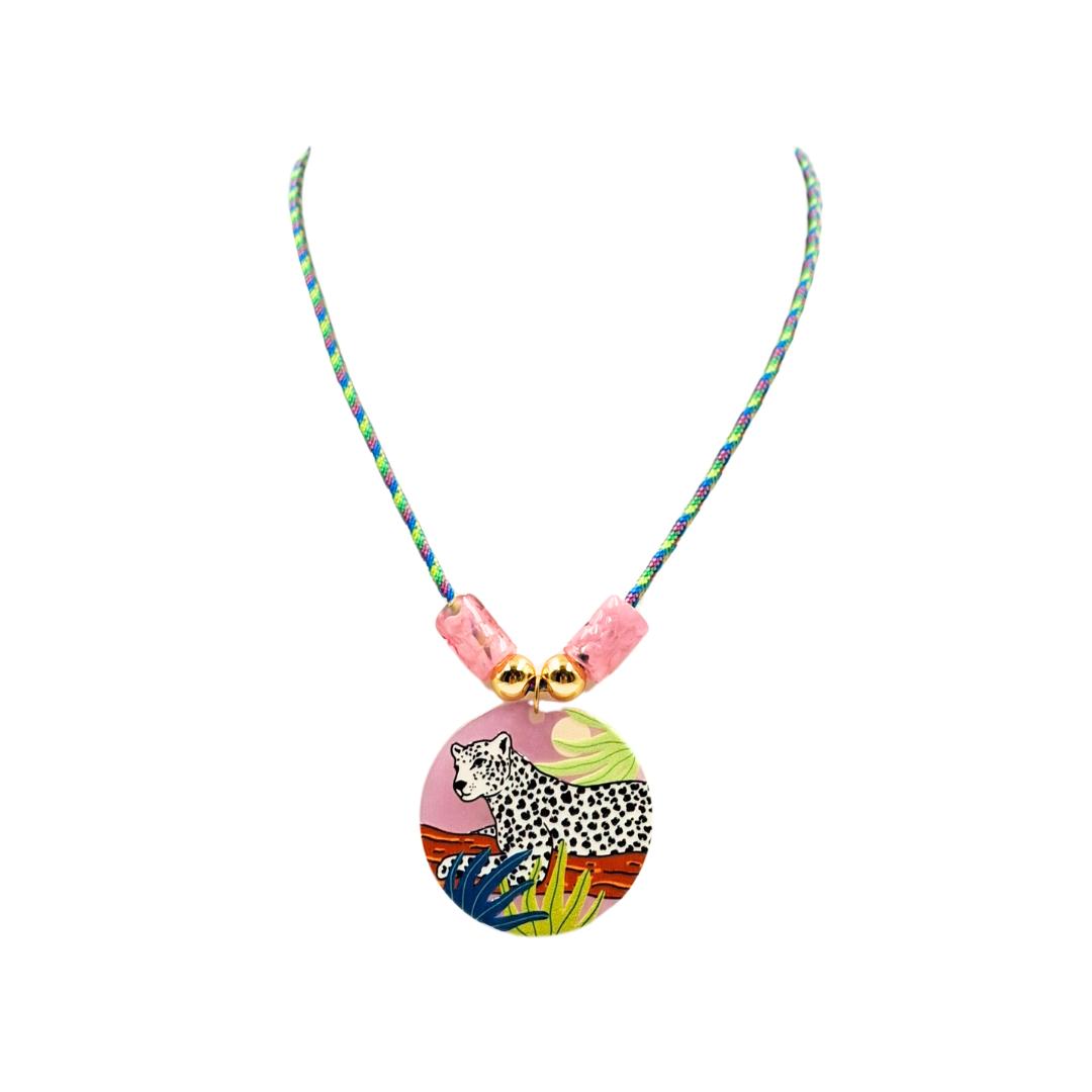 Con una pieza central en metacrilato ilustrado con una pantera en tonos rosa, este diseño combina un cordón multicolor con cuentas acrílicas que dan un toque divertido y original.