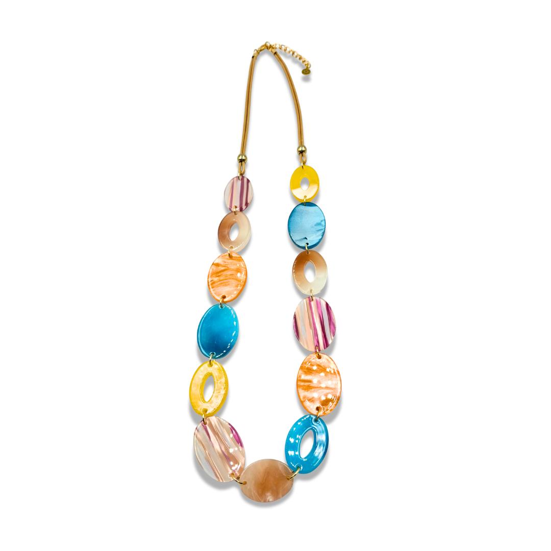 El Collar Lollipop es como llevar una bolsita de chuches siempre contigo. Sus piezas de acrílico multicolor parecen pequeños caramelos brillantes que iluminan cualquier look.