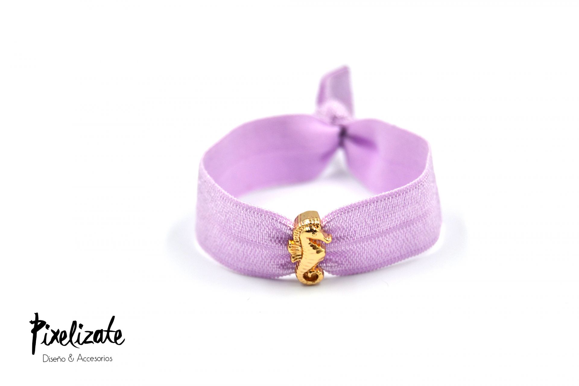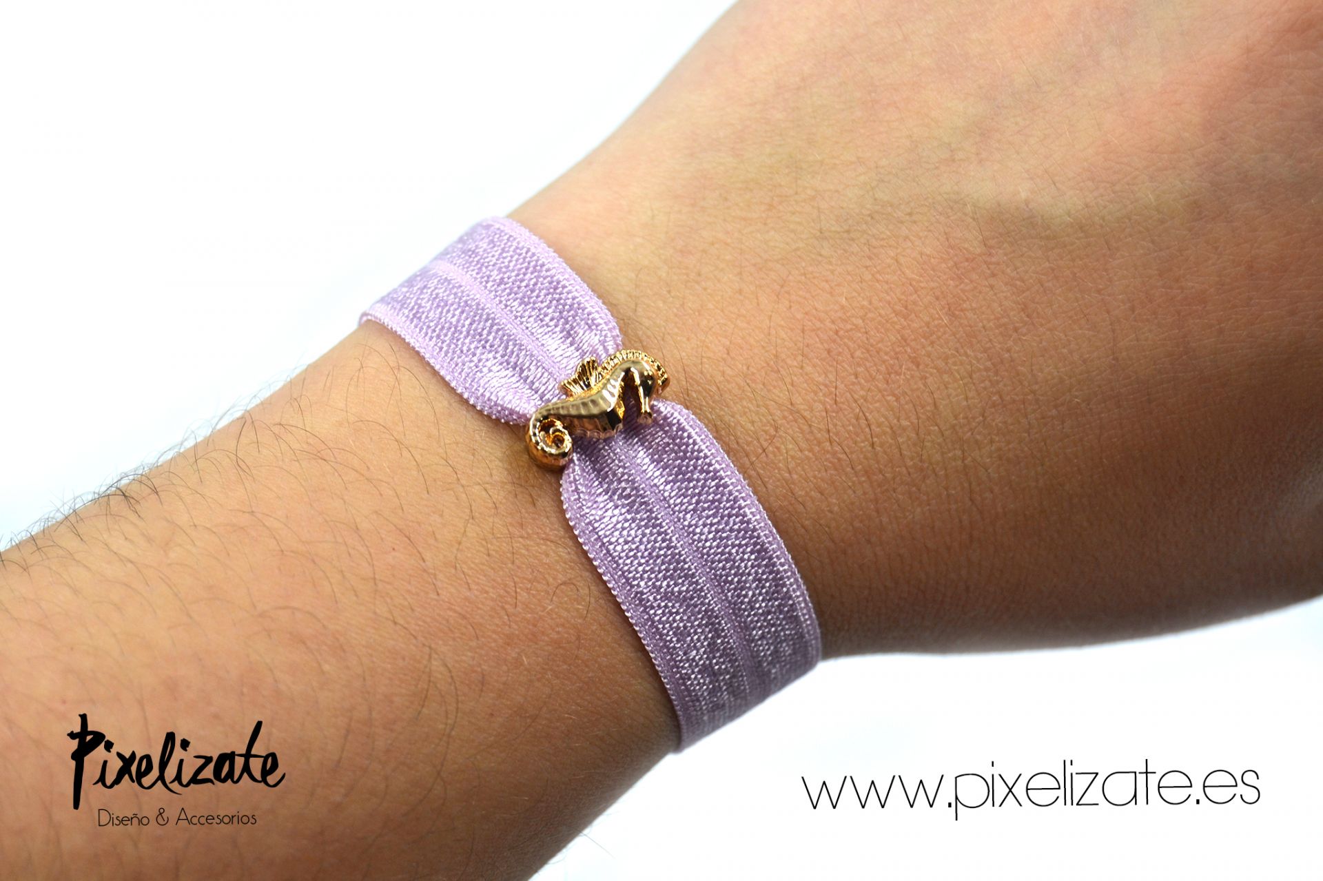 Pulsera hecha a mano con cinta de fibra sintética Spantex (15mm de ancho) con entrepieza de acero en forma de Caballito de Mar.